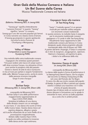 Ideato e diretto da Davide Hong Shin Kil, Presidente di Amc (Associazione Musicisti Coreani) in Italia, e da Jeong Un Kim, insegnante presso il Teatro Regio di Torino, lo spettacolo è riuscito a offrire un dialogo tra alcuni capolavori dell’Opera italiana e le tradizionali musiche e danze coreane. Alcune arie, come il Nessun dorma tratto dalla Turandot di Giacomo Puccini, piuttosto che il Largo al factotum dell’opera Il barbiere di Siviglia di Gioachino Rossini, hanno incontrato celebri canzoni tradizionali coreane come Arirang e Sarang-ga, appartenenti alla narrazione del pansori,dopo l’esibizione di danze come quella dei ventagli, la “danza delle spade” Geommu e la danza con il tamburo Bango. Alle opere italiane si sono aggiunti alcuni importanti motivi internazionali, quali il Salut d’Amour presente nell’Op.12 di Edward Elgar e Là ci darem la mano del Don Giovanni di Wolfgang Amadeus Mozart.